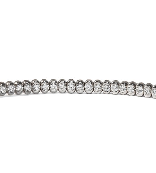 La pulsera de diamantes ADANA es un diseño clásico de pulsera riviere donde los diamantes de talla brillante van montados en cuatro garras, uno tras otro, formando un río de brillo y luminosidad. Para este montaje, es necesario que todos los diamantes sean iguales en tamaño de diámetro, calidad de pureza y color, para así crear la belleza en la uniformidad del modelo. El engaste en garras favorece la entrada de luz a los diamantes por toda la superficie de la gema, reflejando y ampliando la intensidad y el brillo, con lo cual se obtiene la máxima belleza y luminosidad de la pulsera.