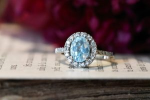 Así es el anillo BAJAMAR de Las Bodas de Tatín. Una joya con un corte clásico, pero con un diseño muy moderno gracias a su modelaje en forma de orla con diamantes la cual tiene como protagonista una bella aguamarina azul natural.