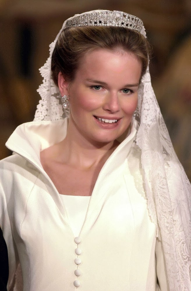 La reina Matilde de Bélgica usó el día de su boda una diadema de platino y diamantes de estilo art-decó, con diseño geométrico y tres filas de diamantes que perteneció en su día a Sissi Emperatriz. La reina Paola ha lucido esta pieza siendo princesa de Lieja en numerosas ocasiones, convirtiéndose en una de sus piezas fetiche..jpg)