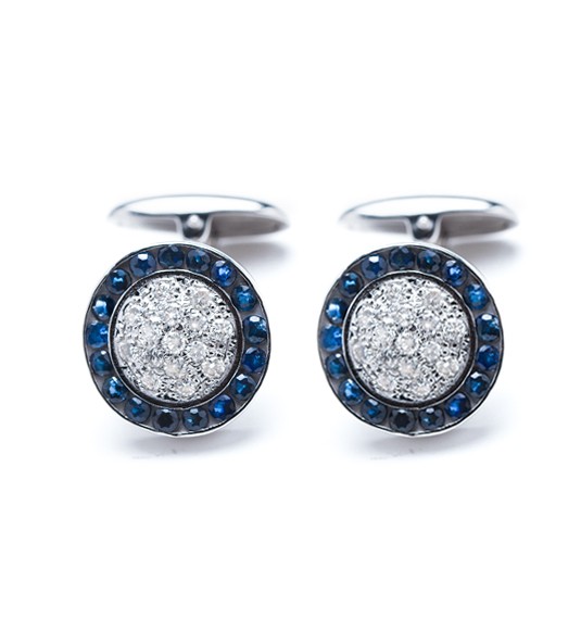 A tonalidade das gemas do modelo HERMANN é o que o caracteriza, diferenciando-se dos restantes. Por um lado, tem-se o azul intenso das safiras em pavée, acompanhadas pelos melhores diamantes. Por outro, o modelo HERMANN conta com um elegante sistema de fecho, muito seguro, graças ao tipo torpedo, transformando-os em botões de punho elegantíssimos, muito fáceis de pôr.